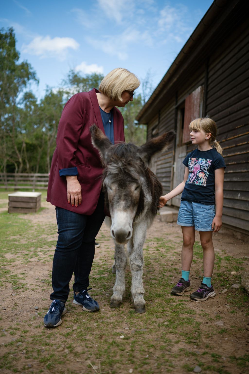 Nach den ernsteren Themen wurde Frau Rehlinger durch den Tierbereich geführt und lernte unsere zwei- und vierbeinigen Mitarbeiter*innen kennen, insbesondere Pony Manfred und Hund Hektor, die sofort ihr Herz eroberten. Frau Preßmar-Brun betonte nachdrücklich, dass es ihr und ihrem Team ein tiefes Anliegen ist, den Kindern einen Ort zum selbstbestimmten und unangeleiteten Spiel zu bieten. Die Farm sei seit über 40 Jahren eine Oase, die den Kindern primäre Erfahrungen mit den verschiedenen Elementen ermöglicht und Bildung für nachhaltige Entwicklung (BNE) fördert, indem ein Verständnis für ökologische Zusammenhänge und einen respektvollen Umgang mit Natur und Tieren vermittelt wird.