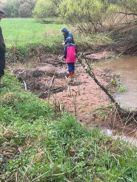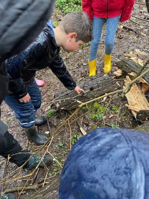 Während der Exkursion machten wir noch viele weitere spannende Entdeckungen, wie einen gefällten Baum mit der typischen sanduhrförmigen Fresszeichnung. Die Kinder waren begeistert dabei, trotz des stetigen Regens und kühler Temperaturen. Ein gemütliches Lagerfeuer mit Stockbrot auf der Farm verwöhnte alle im Anschluss und bot Gelegenheit, die tollen neuen Erfahrungen zu teilen.