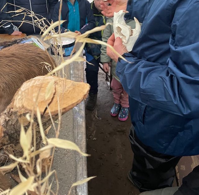 Mit großer Begeisterung empfingen die Kinder Herrn Kollmann und seine beiden biberischen Begleiter, die sofort das Interesse der jungen Naturforscher*innen weckten. Gespannt und voller Fragen drängten sich die Kinder um den Experten, um mehr über diese faszinierenden Tiere zu erfahren. Von der Lebensweise der Biber bis hin zu ihrer Bedeutung im Ökosystem reichten die neugierigen Fragen, denen Herr Kollmann geduldig und anschaulich Antwort gab. Dabei ermutigte er die Kinder, eigene Antworten zu finden und ihre Fantasie zu nutzen, um die Geheimnisse der Natur zu erkunden.